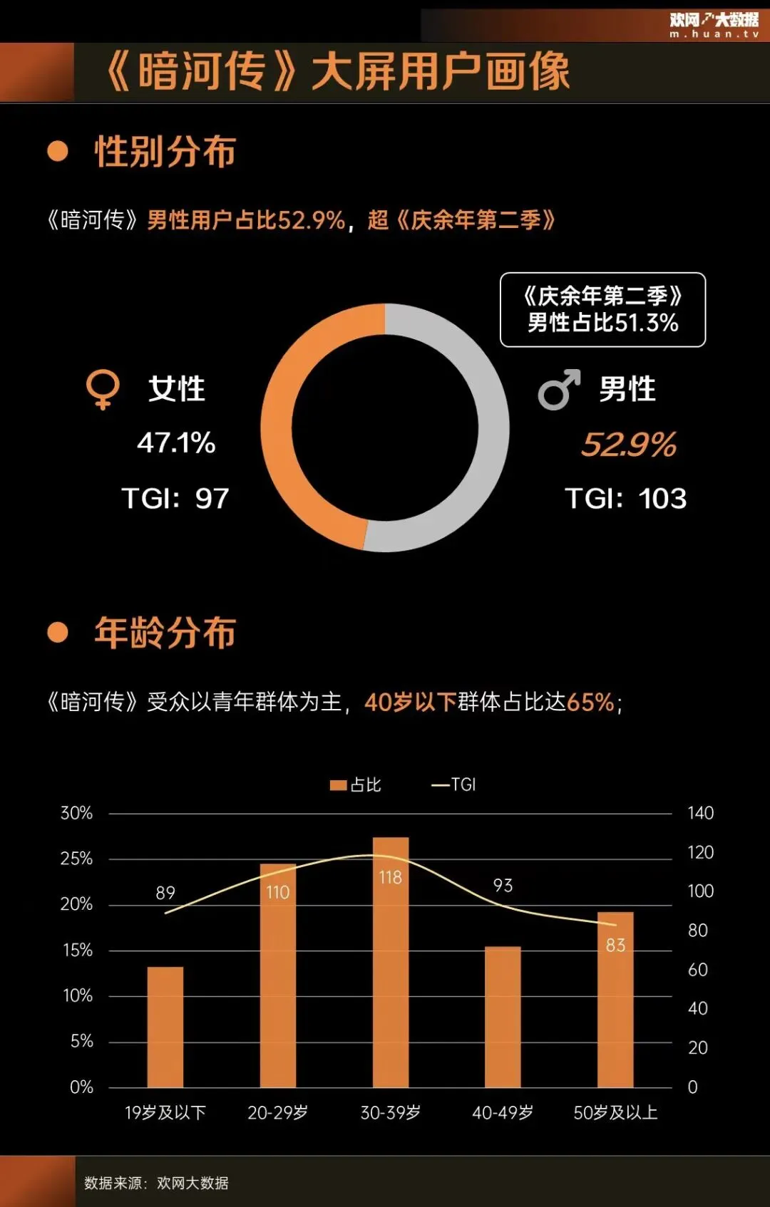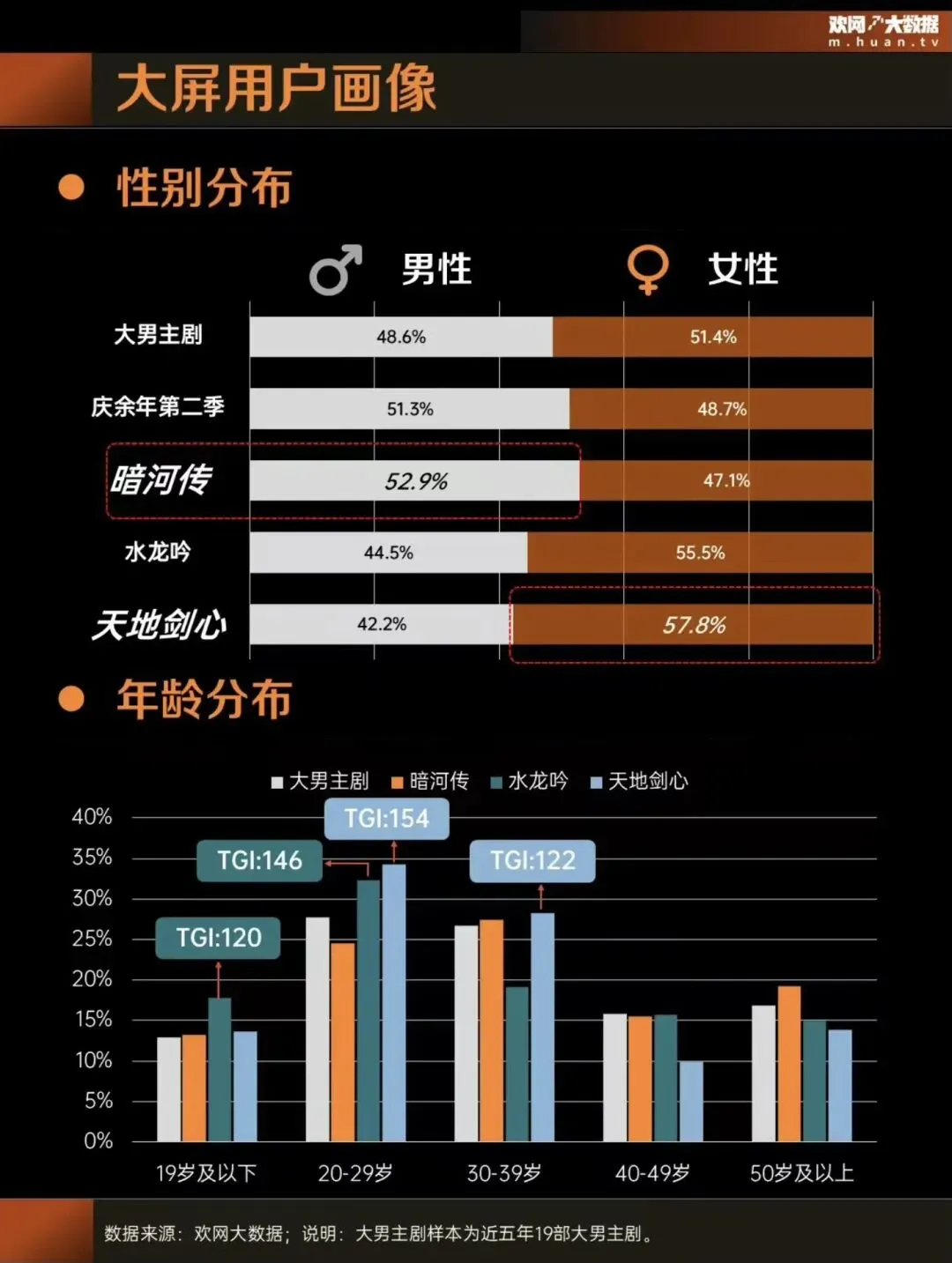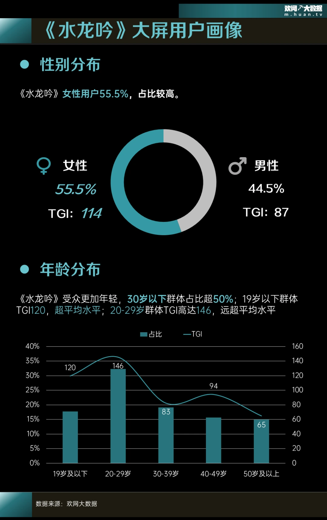这样的“情感化”处理,本质上是将男频IP中“世界为何”的命题,转化为女频审美更易接受的“人物何为”的命题。它降低了非原著观众的准入门槛,让观众首先被“人的处境”所吸引,进而主动探索“世界的规则”。这一转变显著吸引了更多女性与年轻观众,以《水龙吟》为例,【欢网大数据】显示其大屏用户中女性占比达55.5%(TGI 114);同时受众更加年轻,30岁以下群体占比超50%,其中20-29岁群体TGI高达146,远超平均水平,证明了情感化叙事的强大吸引力。